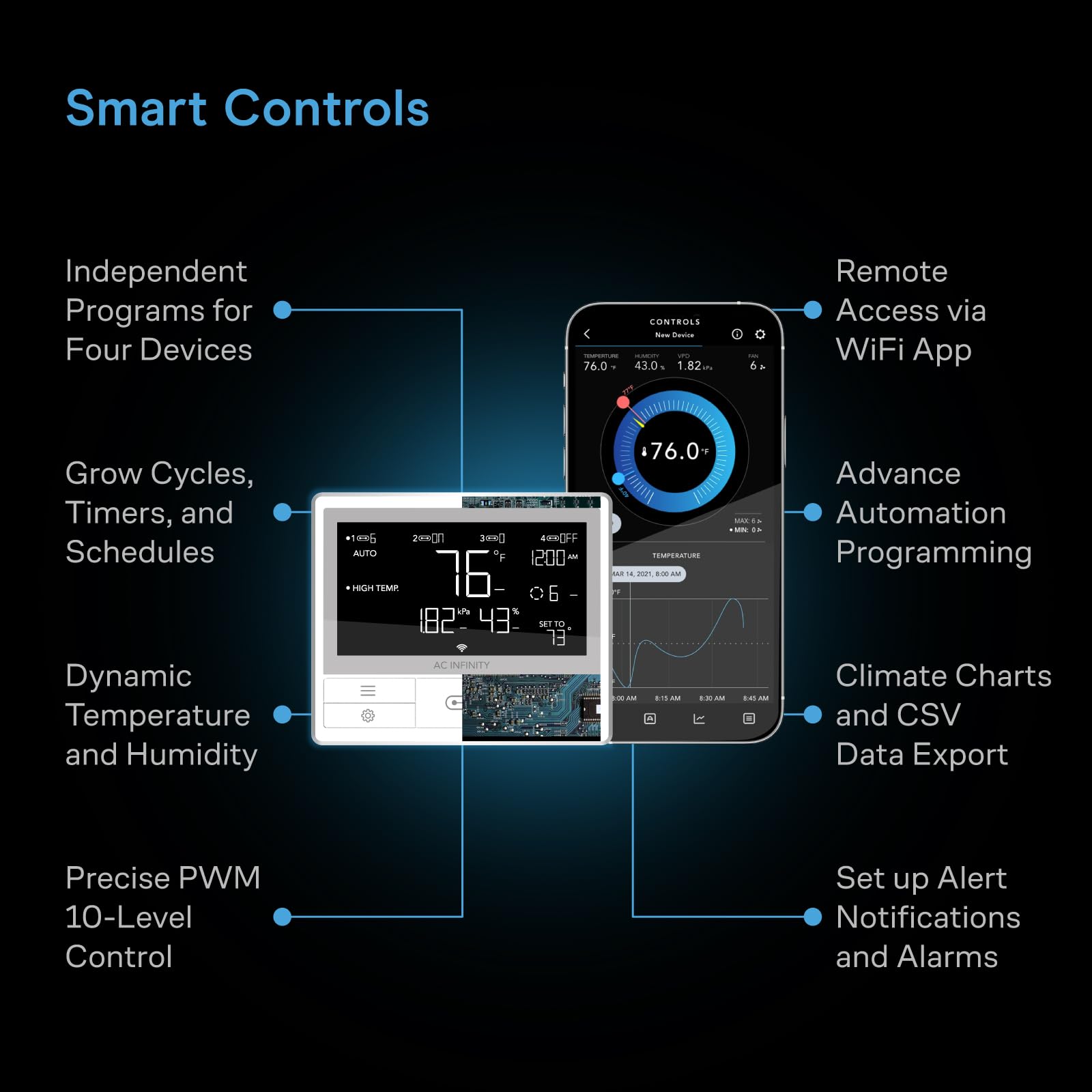 - Dynamic temperature and humidity programming, with timers, cycles, scheduling, and minimum speed.